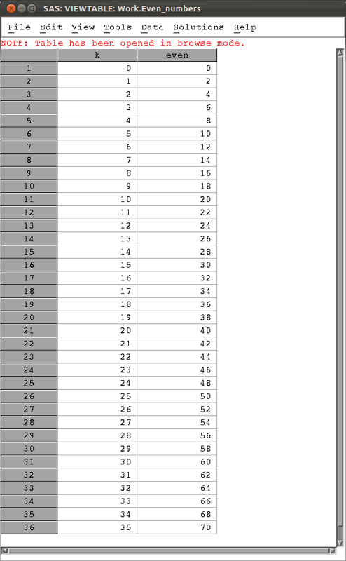 Note that do iterative statements (also called "do loops") are often used in conjunction with the "output" statement which empties the pdv to the output data set. The following code outputs the variables in the pdv: "k" and "even" at each iteration of the do statement. The output is shown.