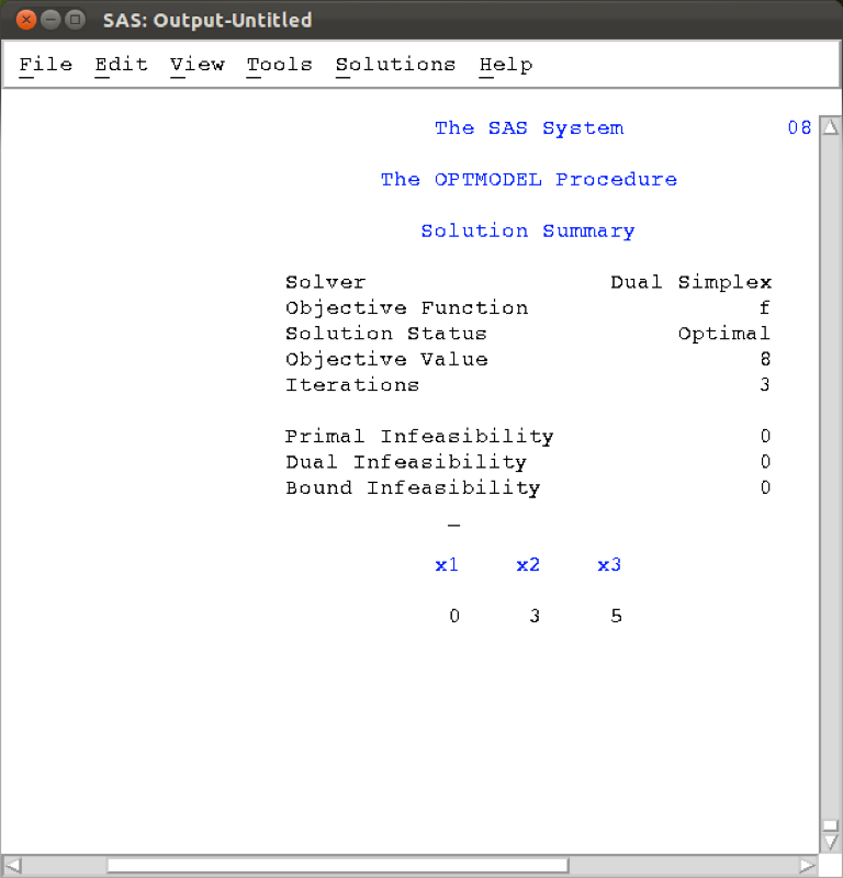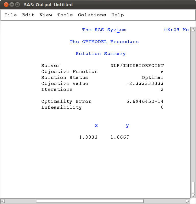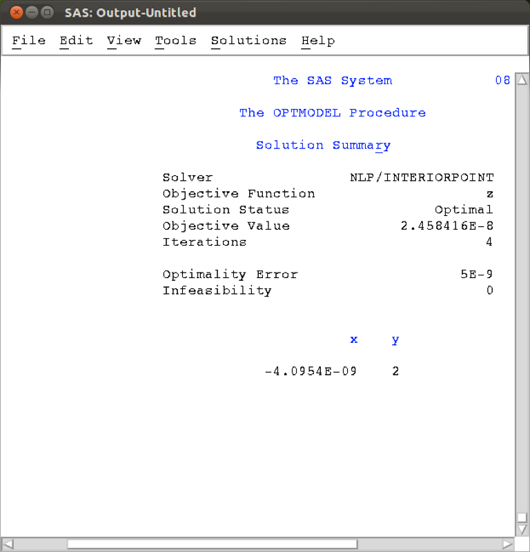 The output is shown, note that SAS automatically chooses a solver (in this case Non Linear Programming and Interior Point methods).