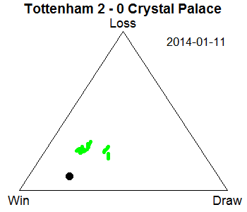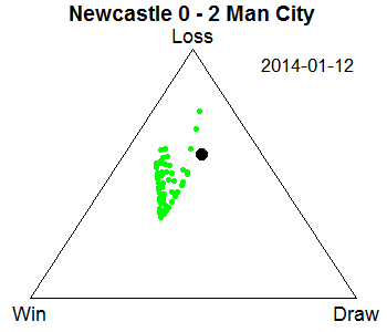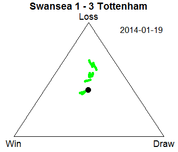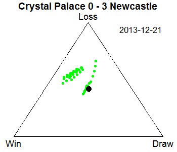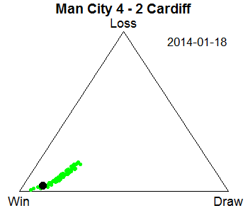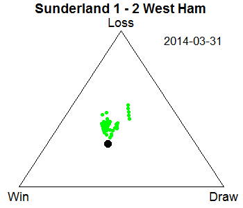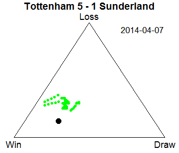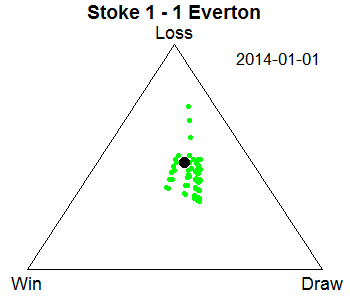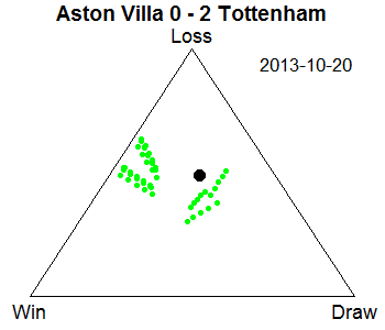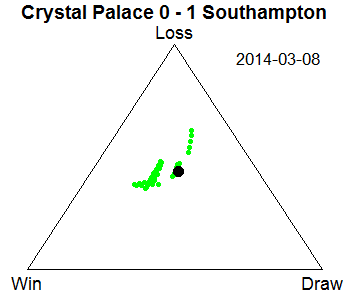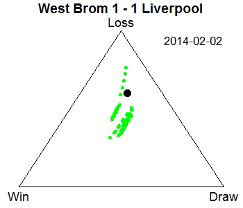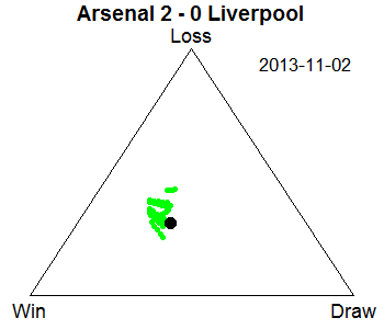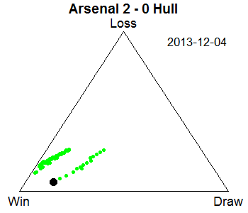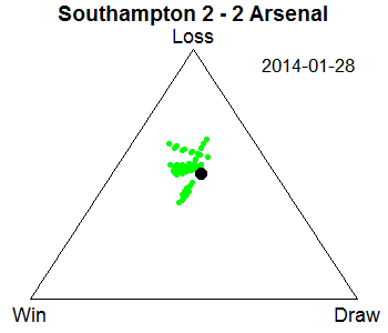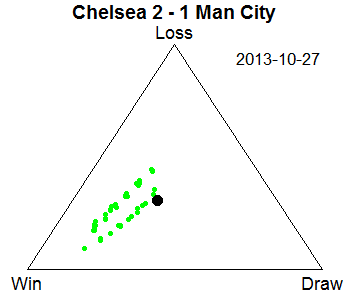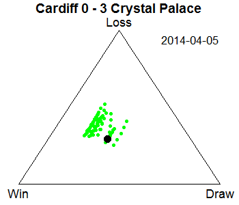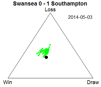 Ternary plots of probabilities estimated from match results and bookmaker's probabilities for Barclays Premier League 2013/14